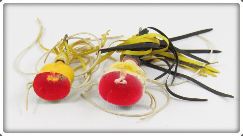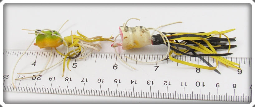 The Frog is nice with light wear and the Coachdog has some worm burns on the belly but is still neat for display. Both have some of the expected broken/brittle rubber band legs and skirts. These would be fun to fish with! The price is for the pair.