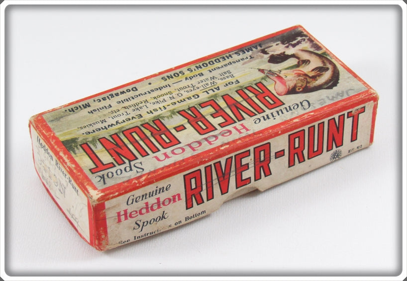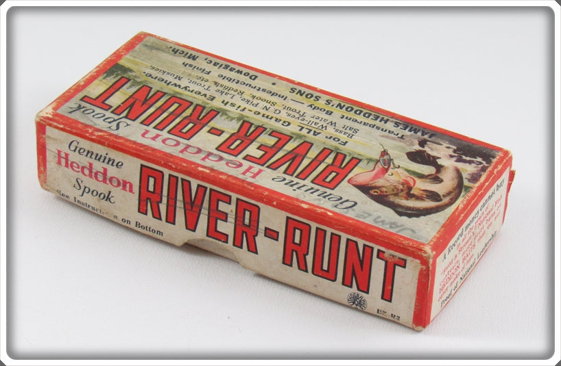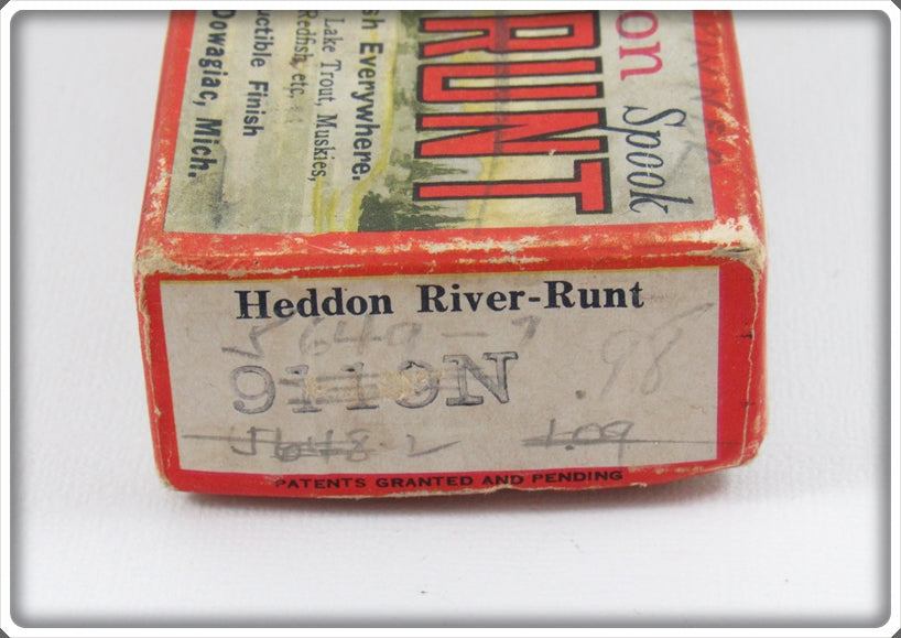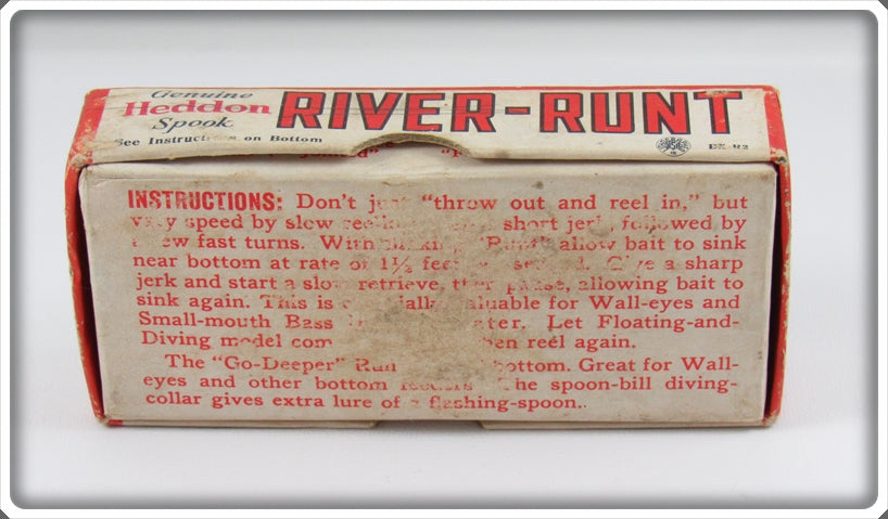 This empty box is pretty nice with a little normal wear and it has some pencil writing on it. It is stamped 9110N for a Dace River Runt Spook Sinker. It's a tough box to match up with your lure!