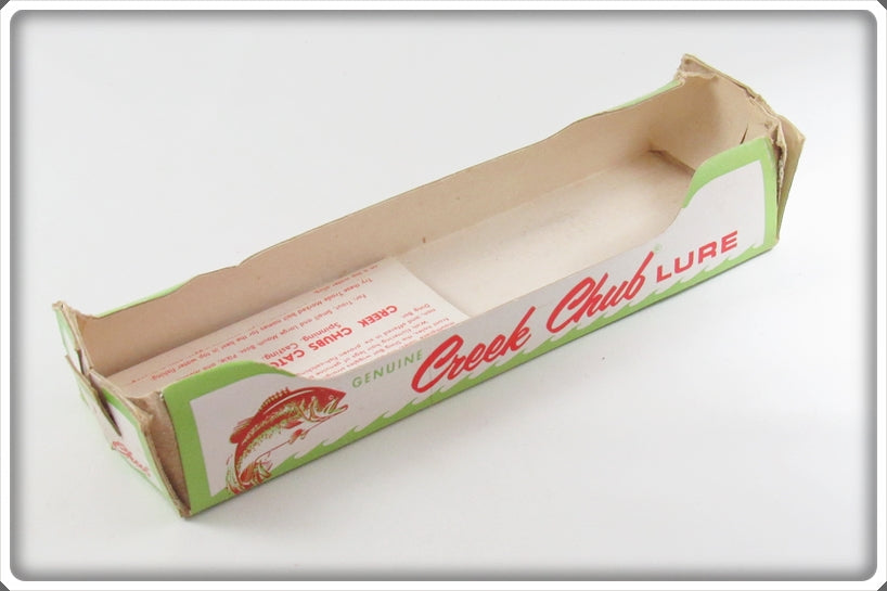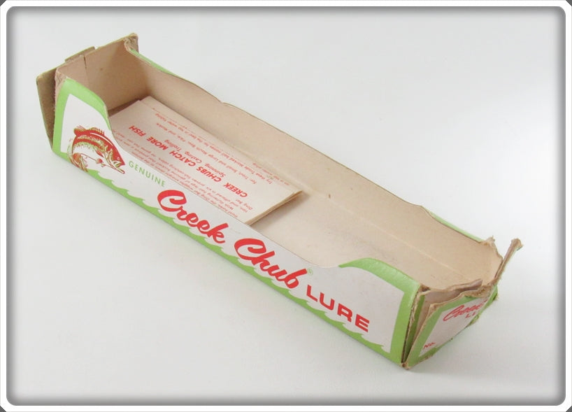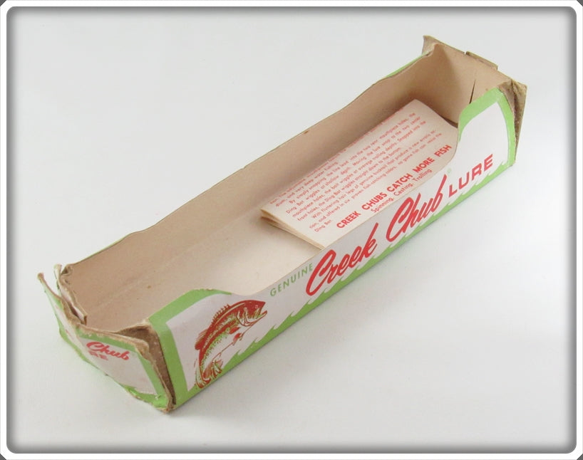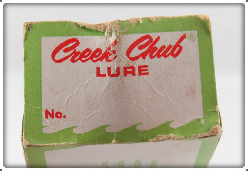 This wooden with tack eyes lure is very nice and unused. The box bottom has some wear as shown and is missing the lid. It is very faintly stamped but you can just barely tell it is correctly stamped 2634 W. This beautiful color is tough to find!
