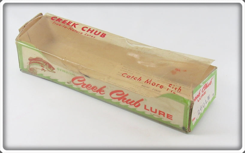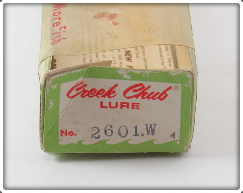 This wooden with tack eyes lure is very nice with light wear. The box lid has some yellowing and damage but the box is correctly stamped 2601 W. It's a neat combo to add to your collection!