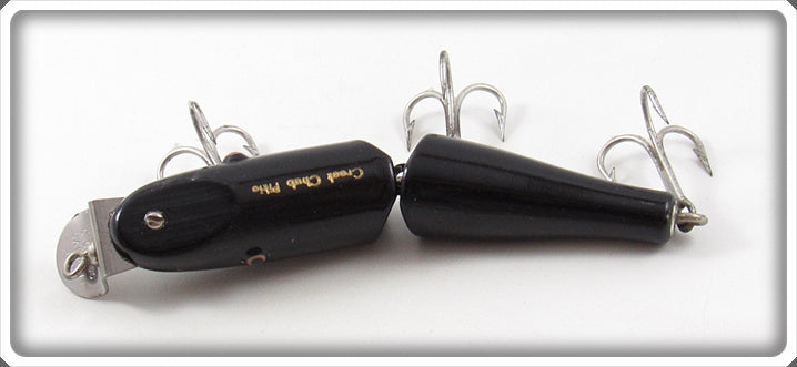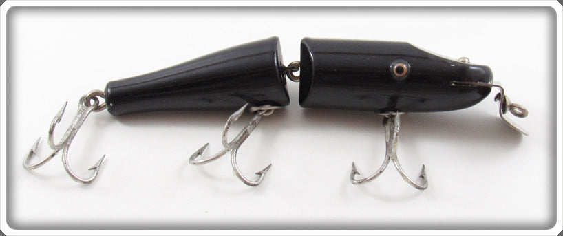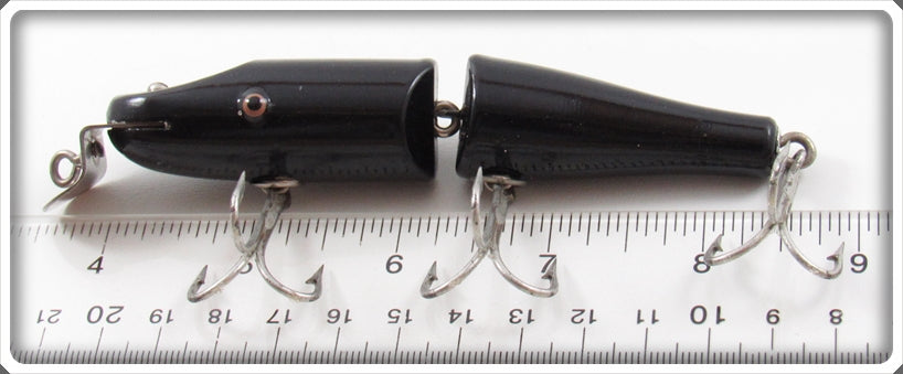 This wooden with tack eyes lure is nice with light wear and minor hook swipe under the chin. All black is a rarely seen color!