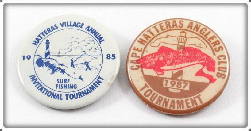 The pins are nice with a little normal wear and some rusting on the back. One is the 1985 Hatteras Village Annual Surf Fishing Invitational Tournament and the other is the 1987 Cape Hatteras Anglers Club Tournament. You don't see either one of these very often! The price is for the pair.