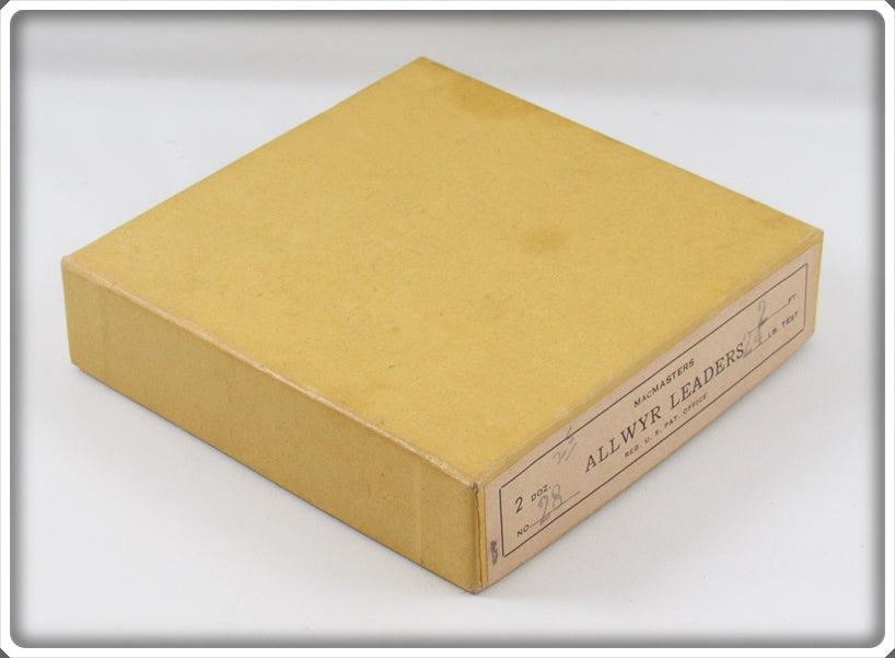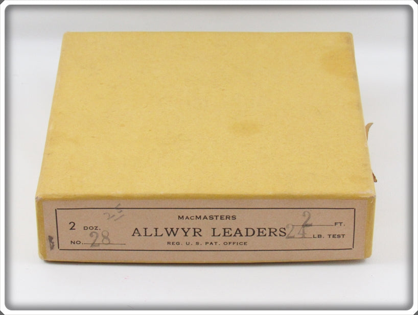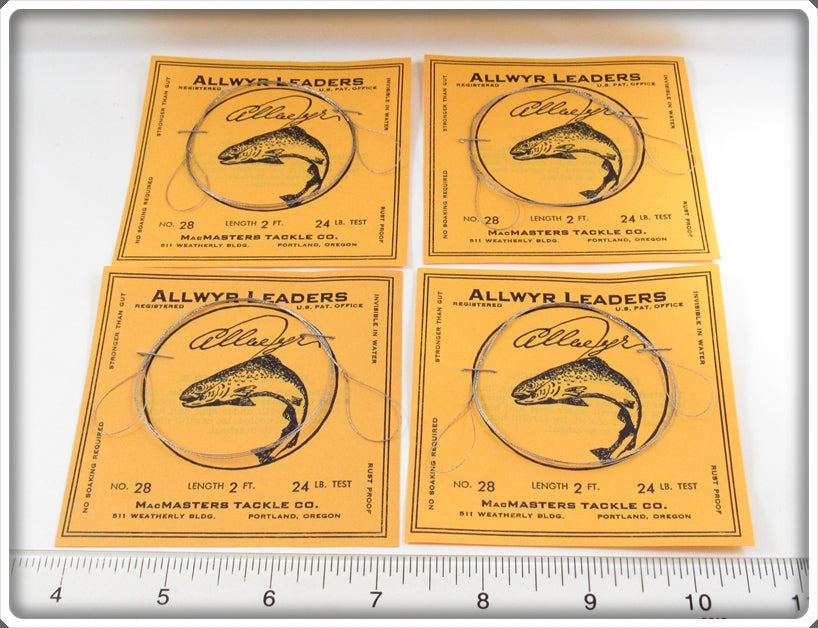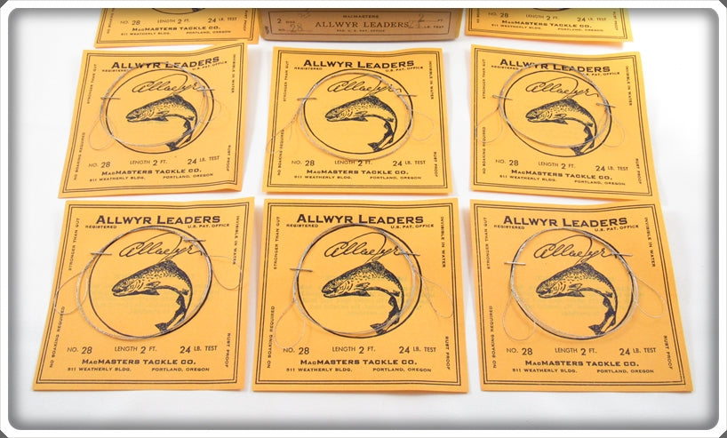 The leaders are all unused and still on their original paper backers. The box is correctly labeled Allwyr Leaders No. 28, 2 ft, 24 lb Test. There are ten left in what would have been a box of two dozen. This is not something you see very often!