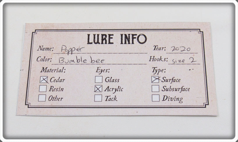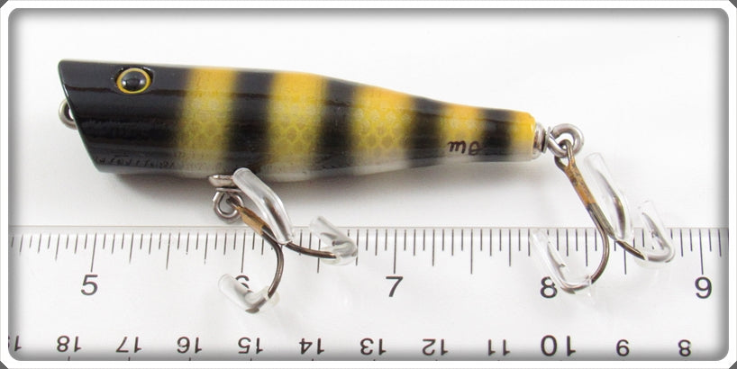 The lure is very nice and unused. The paper insert is correctly marked Popper Bumble Bee. This is a cool color to put on display!