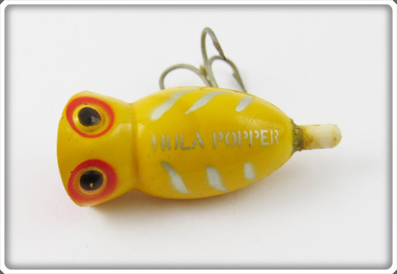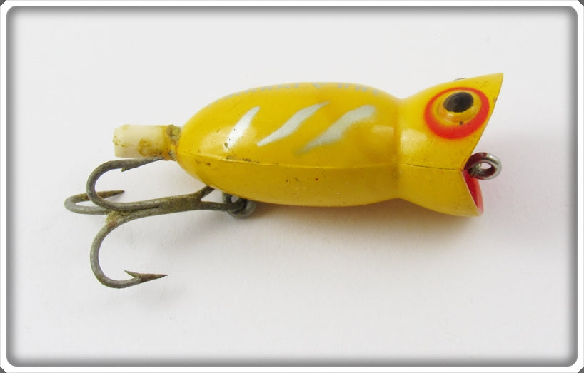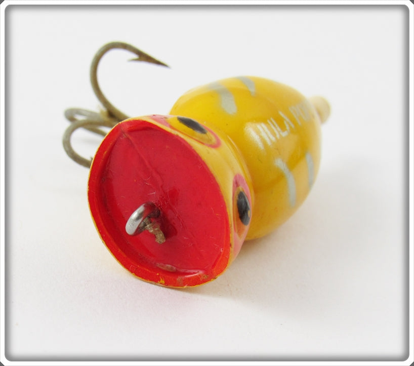 This is a nice old Fred Arbogast Yellow Silver Ribs Fly Rod Hula Popper lure that was sold on Lure Lagoon! Vintage old fishing lures are added for sale often so keep checking back! I buy old lures so feel free to contact me if you have any to sell.