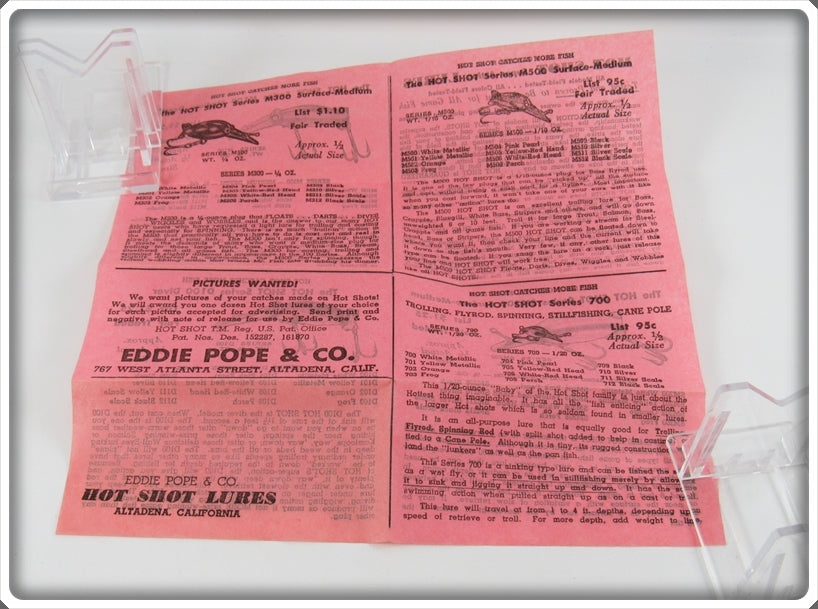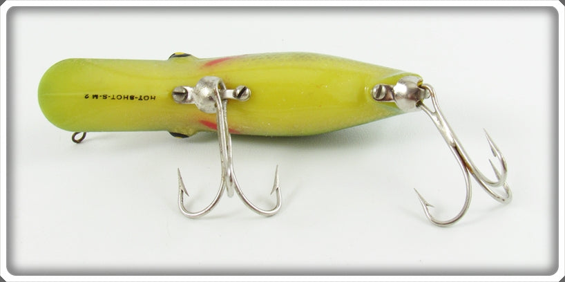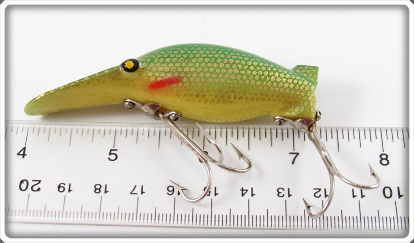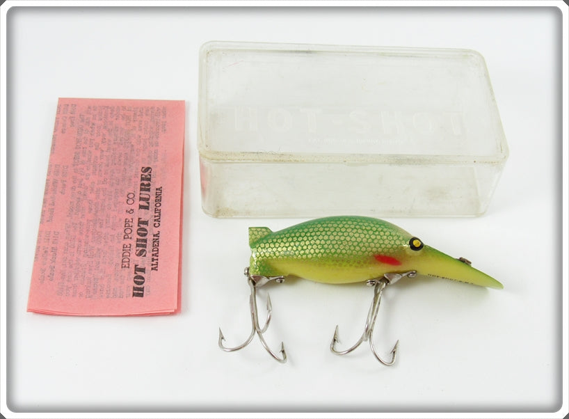 This is a nice old Eddie Pope Green Scale Hot Shot lure that was sold on Lure Lagoon! Vintage old fishing lures are added for sale often so keep checking back! I buy old lures so feel free to contact me if you have any to sell.