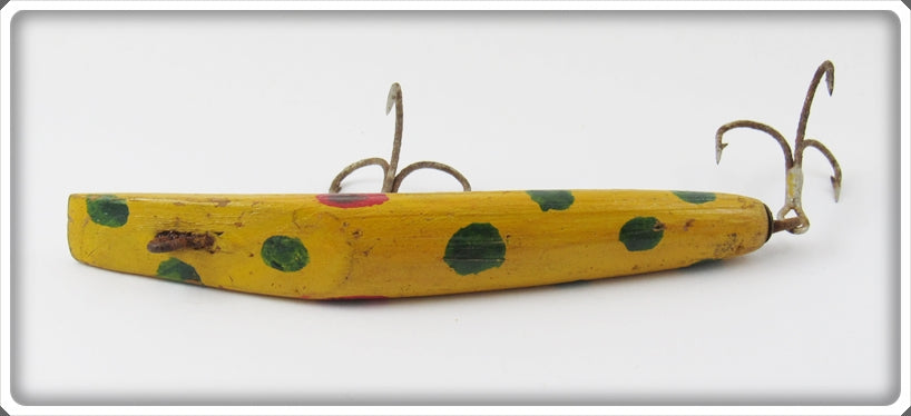 This is a nice old Folk Art Yellow & Green Flatfish Type lure that was sold on Lure Lagoon! Vintage old fishing lures are added for sale often so keep checking back! I buy old lures so feel free to contact me if you have any to sell.
