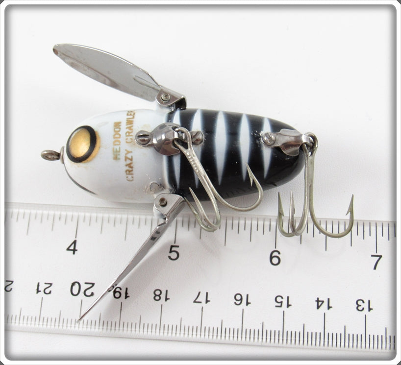 This is a nice old Heddon Black White Head Crazy Crawler lure that was sold on Lure Lagoon! Vintage old fishing lures are added for sale often so keep checking back! I buy old lures so feel free to contact me if you have any to sell.