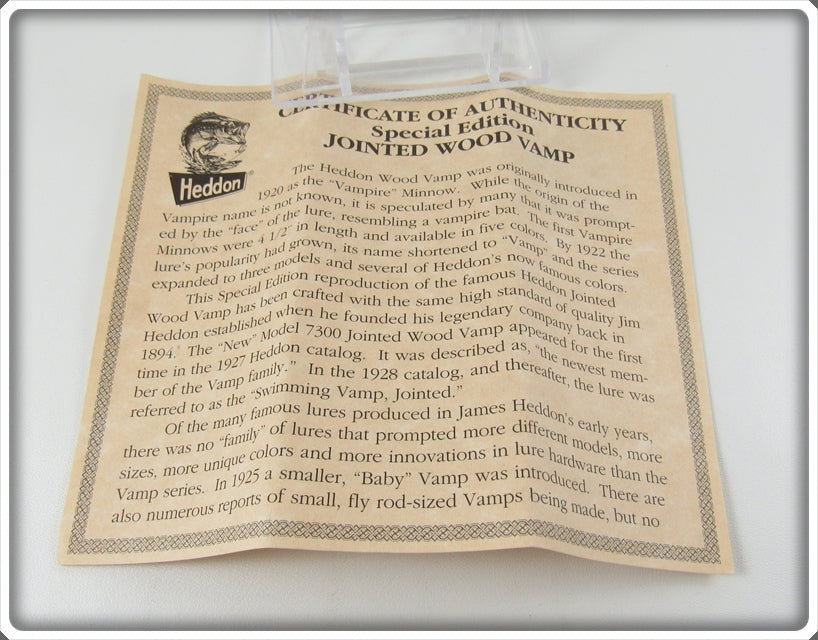 This is a nice Heddon Perch Special Edition Wood Vamp lure that was sold on Lure Lagoon! Vintage old fishing lures are added for sale often so keep checking back! I buy old lures so feel free to contact me if you have any to sell.