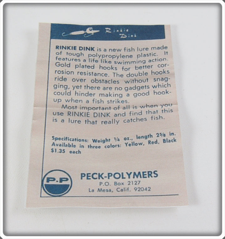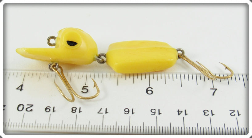 This is a nice old Peck Polymers Yellow Rinkie Dink lure that was sold on Lure Lagoon! Vintage old fishing lures are added for sale often so keep checking back! I buy old lures so feel free to contact me if you have any to sell.