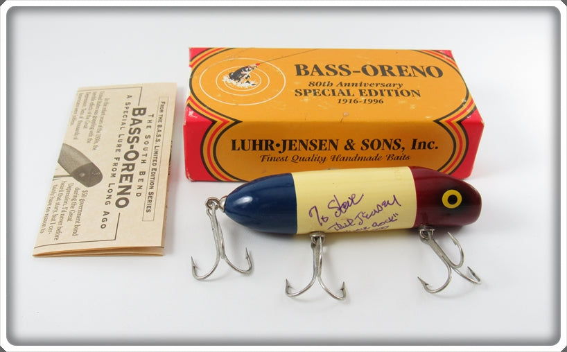 This is a nice South Bend Red, White & Blue Special Edition Bass Oreno lure that was sold on Lure Lagoon! Vintage old fishing lures are added for sale often so keep checking back! I buy old lures so feel free to contact me if you have any to sell.