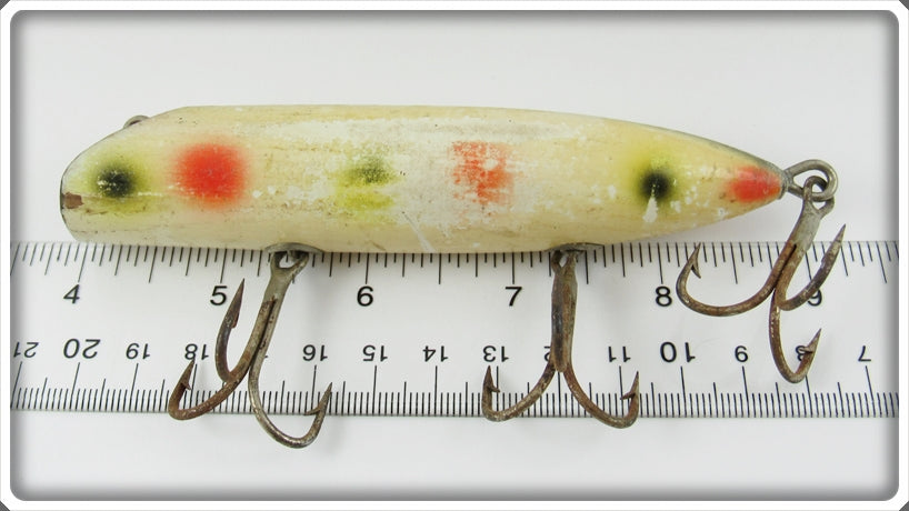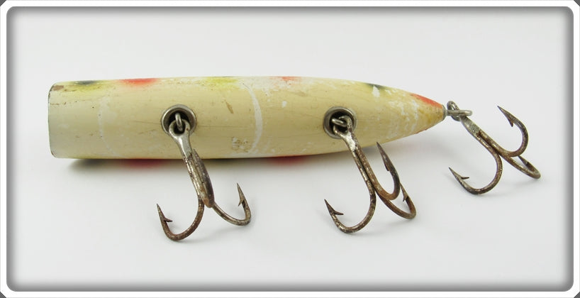 This is a nice old South Bend White With Green & Red Spots Musk Oreno lure that was sold on Lure Lagoon! Vintage old fishing lures are added for sale often so keep checking back! I buy old lures so feel free to contact me if you have any to sell.