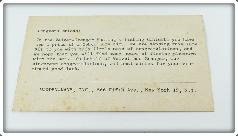 This is a nice old Velvet Granger Hunting & Fishing Contest Zebco lure kit that was sold on Lure Lagoon! Vintage old fishing lures are added for sale often so keep checking back! I buy old lures so feel free to contact me if you have any to sell.